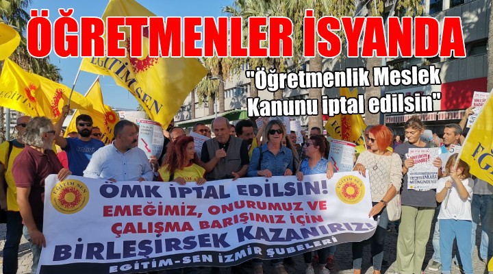 SONKALE?ZM?R- ?zmir Konak Meydan?'nda bugün toplanan ö?retmenler, "Kariyer de?il, itibar istiyoruz", "Kurtulu? yok tek ba??na. Ya hep beraber ya hiçbirimiz", "ÖMK iptal edilsin" sloganlar? at?p, "ÖMK iptal edilsin. Eme?imiz, onurumuz, çal??ma bar???m?z için birle?irsek kazan?r?z" pankart? açt?.