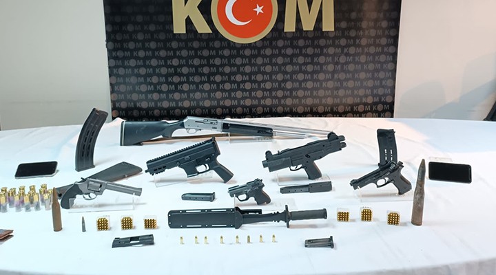 ?üphelinin Foça'daki evine düzenlenen operasyonda, 2'si tam otomatik 5 tabanca, otomatik av tüfe?i, 158 tabanca fi?e?i, 23 kartu?, 2 uçaksavar mermisi, uzun namlulu silah fi?e?i, 10 tabanca parças? ile kama ele geçirildi.