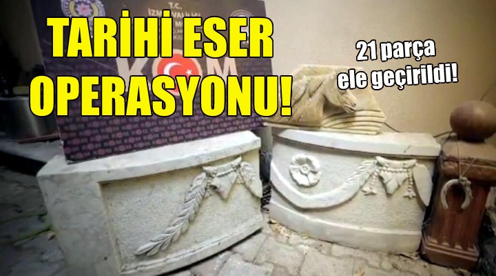 Buca ve Karaba?lar ilçelerindeki 2 ev ile 1 ?üphelinin üst aramas?nda, Bizans ve Osmanl? dönemlerine ait, üzerinde hayvan ve çiçek motifleri bulunan 3 mermer mimari parça, 2 ta? sütun, 11 sikke, 1 yüzük, 2 ok ucu, 1 kur?un obje ve 1 kolye ucu ele geçirildi. ?üpheli 3 ki?i hakk?nda, Kültür ve Tabiat Varl?klar?n? Koruma Kanunu'na muhalefet suçundan tutanak tutulup, adli i?lem ba?lat?ld?.