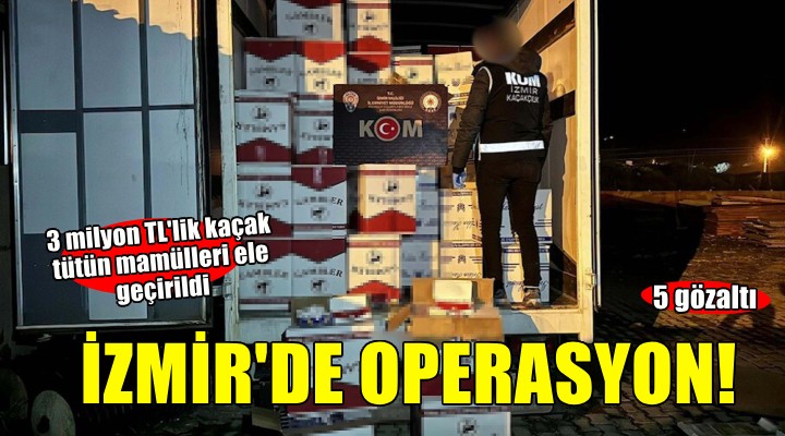 Kemalpa?a Cumhuriyet Ba?savc?l??? koordinesindeki Kaçakç?l?k Suçlar?yla Mücadele ?ube Müdürlü?ü ekipleri, ?zmir'de kaçak tütün mamulleri ticaretinin önlenmesine yönelik çal??ma yapt?. 29 Ocak'ta Kemalpa?a ilçesinde durdurulan TIR, minibüs ve kamyonette yap?lan aramalarda piyasa de?eri yakla??k 3 milyon TL olan toplam 7 milyon 320 bin makaron ele geçirildi. 5 ?üpheli, gözalt?na al?nd?. Haklar?nda adli i?lem yap?lan ?üpheliler serbest b?rak?ld?.