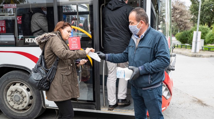 ?zmir Büyük?ehir Belediyesi otobüs, metro, tramvay ve gemi yolcular?na aktarma merkezlerinde, istasyonlarda, duraklarda ve iskelelerde ücretsiz maske da??tmaya ba?lad?.
