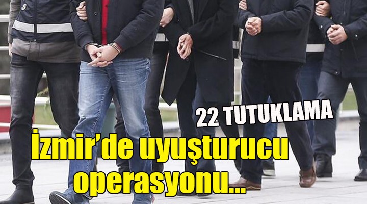 ?zmir ?l Emniyet Müdürlü?ü Narkotik Suçlarla Mücadele ?ube Müdürlü?ü ekipleri, uyu?turucu ticaretinin önlenmesine yönelik kent genelinde 19 ayr? operasyon düzenledi. ?üphelilerin üstleri, ev ve adreslerindeki aramalarda, 19 kök Hint keneviri, 10 kilo 84 gram esrar ve skunk, 12 uyu?turucu hap, 6 gram kokain, 1 kilo 869 gram sentetik kannabinoid, 541 gram eroin, 2 kilo 210 gram metamfetamin, 95 sentetik ecza ilac?, 5 hassas terazi, 6 ruhsats?z tabanca, 1 uzun namlulu silah, 2 av tüfe?i ile 221 mermi ve fi?ek ele geçirildi. Operasyonlarda toplam 42 ?üpheli gözalt?na al?nd?. Adliyeye sevk edilen zanl?lardan 22'si ç?kar?ld?klar? nöbetçi sulh ceza hakimli?ince tutukland?.