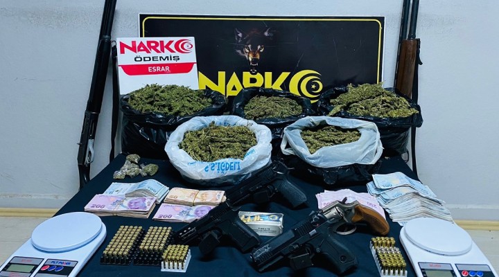 Ödemi? ?lçe Emniyet Müdürlü?ü Narkotik Grup Amirli?i ekipleri, Kiraz'da 2 adrese düzenledi?i bask?nlarda 3,5 kilo esrar, 2 hassas terazi, 2 tüfek ve uyu?turucu sat???ndan elde edildi?i de?erlendirilen 43 bin lira ele geçirdi.