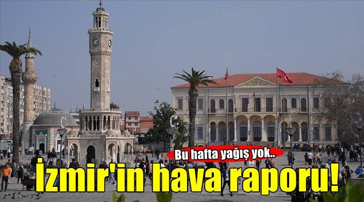 SONKALE?ZM?R- Meteoroloji Genel Müdürlü?ü'nün tahminlerine göre ?zmir’de önümüzdeki 5 gün boyunca ya??? beklenmezken, s?cakl?klar hafta boyu 15-16 derece aras?nda seyredecek. Kent genelinde güne?li ve az bulutlu hava hakim olacak.