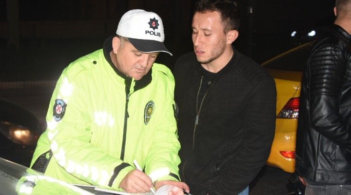 ?zmir ?l Emniyet Müdürlü?ü’nde görevli trafik polisleri, yeni y?l kutlamalar? kapsam?nda kentin birçok noktas?nda denetlemelerde bulundu. Yap?lan denetlemelerde y?l?n ilk cezas? Alsancak Gar’da polis ekipleri taraf?ndan durdurulan 45 AAZ 731 plakal? otomobilin sürücüsü Ferhat Y.'ye uyguland?. Yap?lan alkol kontrolünde, Ferhat Y. 1.29 promil alkollü ç?kt?. Y?lmaz’a 6 bin 735 TL idari para cezas? kesilirken, 6 ay ehliyetine el konuldu. Ayr?ca otomobil geçici süre trafikten men edildi.