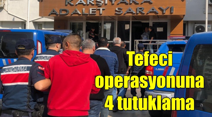 Kar??yaka Cumhuriyet Ba?savc?l???'n?n, Bayrakl? ve Kar??yaka ilçelerinde tefecilik yapt??? belirlenen ki?ilere yönelik ba?latt??? soru?turma kapsam?nda, ?zmir ?l Jandarma Komutanl??? ve Kar??yaka ?lçe Jandarma Komutanl??? bir dizi operasyon düzenledi. 11 Ekim'de önceden belirlenen adreslere düzenlenen operasyonlarda, paraya ihtiyac? olan ki?ilere yüksek faizle para verip, tefecilik usulüyle haks?z kazanç elde etti?i gerekçesiyle 6 ki?i gözalt?na al?nd?.