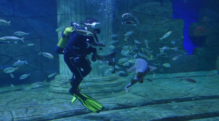 Zeminden ba?layan tünel akvaryumda 2 ya??ndaki çocuklar da bal?klar? keyifle izleyebiliyor. Havuz camlar? üç yeti?kin fili ta??yacak güçte. Ziyaretçiler akvaryumdaki bal?klar? sadece camlar?n arkas?ndan izlemekle kalm?yor, koi bal?klar? ile vatoz bal?klar?n? biberonla besleyebiliyor. Akvaryum fok sesleriyle ünlü siren kayal?klar?yla ba?l?yor, 7 tür köpek bal???n?n bulundu?u havuz, korsan gemi bat???, koi bal?klar?, böcekler ile devam ediyor. Akvaryumda en büyük ilgiyi köpek bal?klar?n?n bulundu?u havuz görüyor. Bir gözü do?u?tan olmayan 'Odin' isimli kum kaplan? türündeki köpek bal??? ziyaretçilerin gözdesi. Ba?ka bal?klar?n da bulundu?u havuzda beslenme saati tam bir ?ölene dönü?üyor. Özel e?itimli dalg?çlar tedbirli bir ?ekilde sal? ve per?embe günleri dalarak, ucunda yem olan uzun bir sopayla bal?klar?n a?z?na yemi b?rak?yor. Yemin kokusunu alan bal?klar, dalg?ç?n etraf?nda toplanarak adeta dans ediyor. Ziyaretçiler de bu anlar?, ilgiyle izliyor. Akvaryumda görevli Su Ürünleri Mühendisi Tu?çe Bask?n, tropikal bölge canl?lar?n?n bulunmas?na daha çok dikkat ettiklerini, bu nedenle ziyaretçilerine benzersiz anlar ya?att?klar?n?, onlar?n da büyük bir be?eniyle ayr?ld?klar?n? anlatt?.