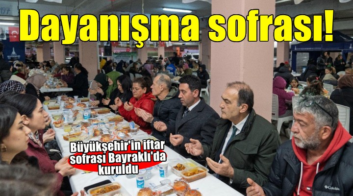 Ramazan ay?n?n ba??ndan itibaren her ak?am bir ilçede dayan??ma amac?yla iftar sofras? kuran ?zmir Büyük?ehir Belediyesi, bu kez de Bayrakl?’ya konuk oldu. ?zmir Büyük?ehir Belediyesi Ba?kan Vekili Dr. Zafer Levent Y?ld?r, Bayrakl? Belediye Ba?kan? ?rfan Önal, ?zmir Büyük?ehir Belediyesi Meclis Ba?kan Vekili Altan ?nanç’?n yan? s?ra muhtarlar, sivil toplum örgütlerinin temsilcileri ve yurtta?lar?n kat?ld??? iftar program?nda dayan??man?n önemine vurgu yap?ld?. Dualar?n okunmas?n?n ard?ndan oruçlar aç?ld?.