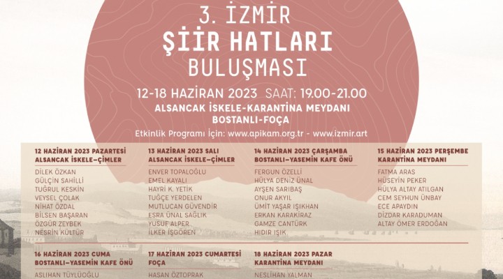 52’si ?air 100 sanatç?n?n kat?laca?? ?iir Hatlar? Bulu?mas?’nda 12 ve 13 Haziran tarihlerinde Alsancak ?skele'de, 14 ve 16 Haziran’da Bostanl? Yasemin Kafe önünde, 15 Haziran'da Karantina Meydan?'nda, 17 Haziran'da Foça Marsilya Meydan?'nda, 18 Haziran'da Karantina Meydan?'nda etkinlikler olacak. ?zmirliler, her gün 19.00-21.00 saatleri aras?nda ?iir Hatlar?’na kat?labilecek. Program?n detay?na www.apikam.org.tr adresinden ula??labilir.
