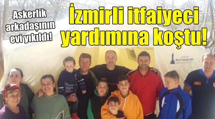 ?zmir Büyük?ehir Belediye Ba?kan? Tunç Soyer’in depremin ard?ndan çizdi?i yol haritas? kapsam?nda Hatay’da görev alan ?tfaiye Dairesi Ba?kanl??? Yang?n ve Acil Müdahale ?ube Müdürlü?ü’nün personeli Mutlu Odaba?, asker arkada?? ile ailesinin yard?m?na ko?tu. Mutlu Odaba?, 1997’de askerli?i birlikte yapt??? Ahmet Ayd?nl? ile e?i Seza Ayd?nl?’n?n depremde evinin y?k?lmas? üzerine ekip arkada?lar?yla ailenin köydeki evinin bahçesine çad?r kurdu.