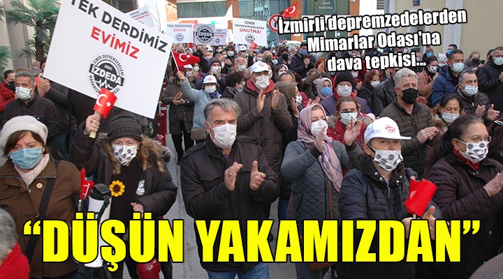 "Tek derdimiz evimiz", "Hak hukuk adalet, davan? geri çek", "Kentsel dönü?ümcü de?il, depremzedeyiz" yaz?l? dövizler ta??yan depremzedeler, Bayrakl?'daki gökdelenler ve içerisinde TMMOB'un ofisinin de oldu?u 17 katl? bir binan?n foto?raf?n?n yer ald??? pankartlar açt?.