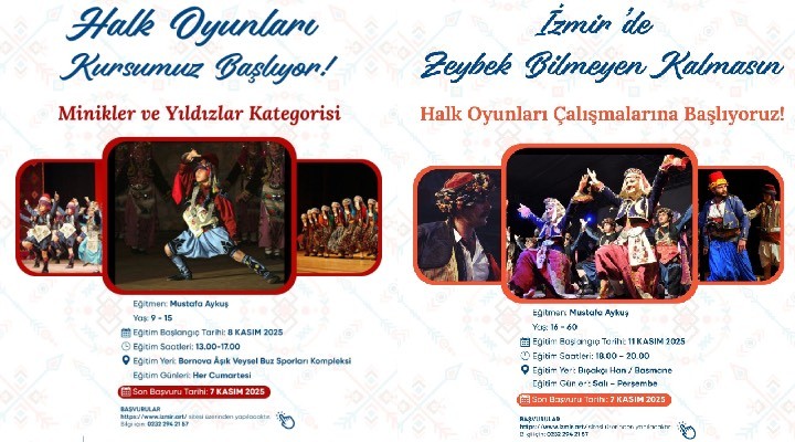 ?zmir Büyük?ehir Belediyesi, halk oyunlar? kurslar? aç?yor. Minikler ve Y?ld?zlar kategorilerinde Halk Oyunlar? Kursu ile zeybek e?itimlerinin verilece?i genç ve yeti?kinlere yönelik Halk Oyunlar? Çal??malar? ba?layacak. Her iki kursun son ba?vuru tarihi ise 7 Kas?m olarak belirlendi. Ücretsiz gerçekle?tirilecek çal??malara ba?vuru yapmak için https://www.izmir.art/ sitesi ziyaret edilebilir. Detayl? bilgi için 0232 294 21 57 numaral? telefon aranabiliyor.